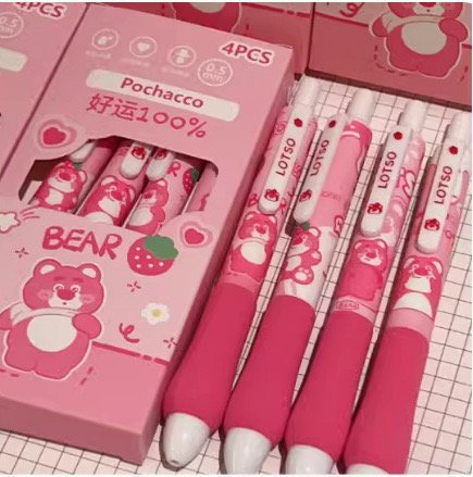 Bring a touch of sweetness to your stationery collection with the Lotso Bear Gel Pen Set. This adorable 4-piece pack features charming Lotso bear designs in cheerful pink tones that brighten up every writing task. With a 0.5mm fine tip, these pens deliver smooth, precise ink flow perfect for journaling, note-taking, doodling, or schoolwork.