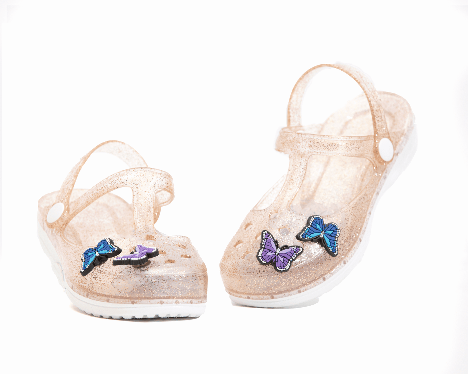Sparkling and stylish, our jelly shoes will complete your little lady’s summer wardrobe The classic waterproof silhouette is features a buckled strap that can be adjusted for the perfect fit and the caged design offers both breathability and protection. Take these to the beach for a day of fun and laughter.