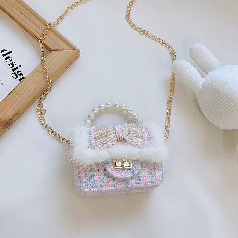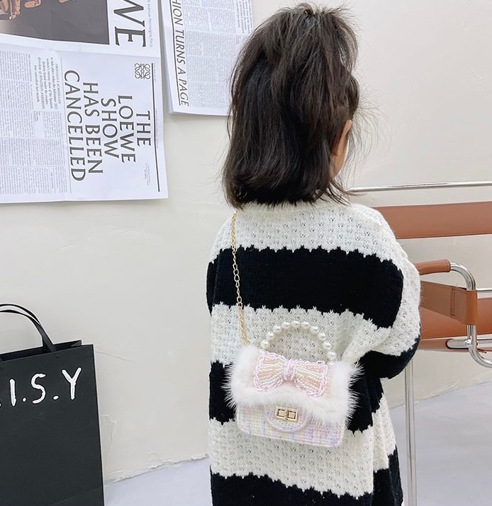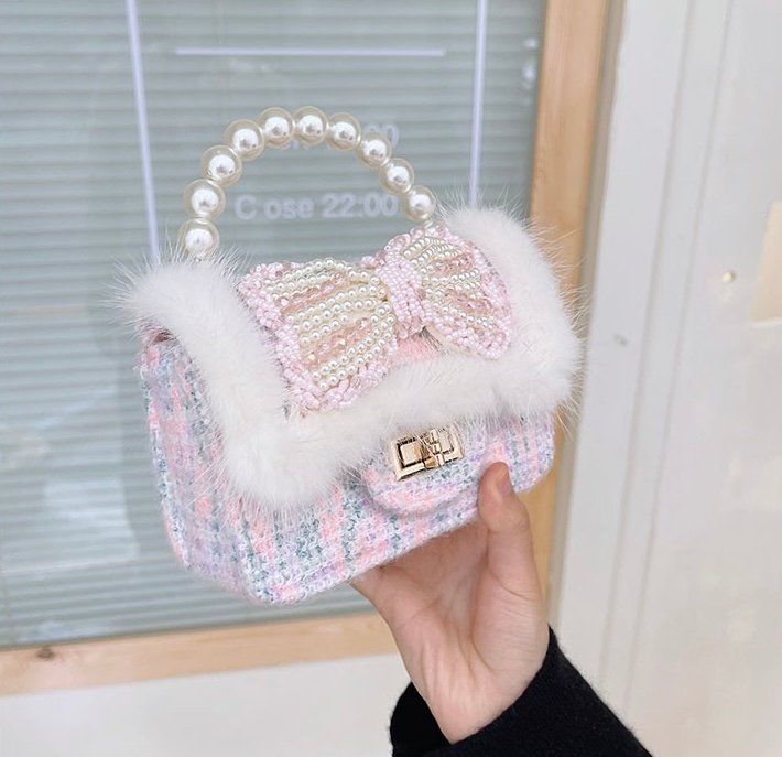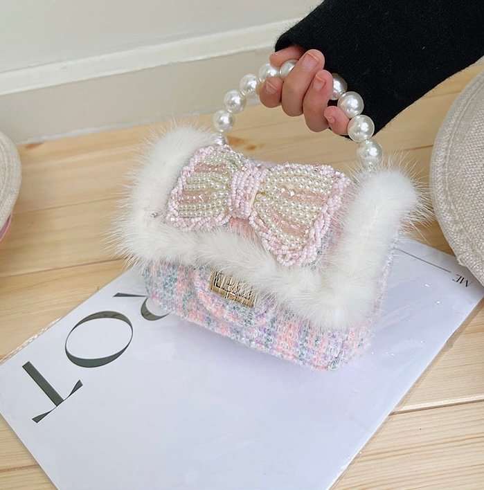 The Pearl Bow Faux-Fur Mini Bag is designed to add a touch of fairytale charm to any outfit. Featuring a soft tweed-style body, plush faux-fur trim, and an elegant pearl-embellished bow, this mini bag is perfect for little fashion lovers who adore delicate details.