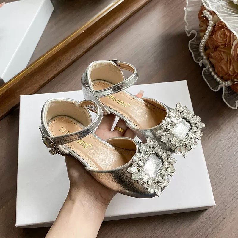 Designed to elevate any special outfit, the Silver Crystal Bloom Dress Shoes feature a metallic finish paired with a beautifully hand-set crystal flower embellishment. The soft cushioned insole and secure ankle strap provide comfort and stability, while the 2 cm block heel adds a touch of elegance suitable for young girls.