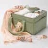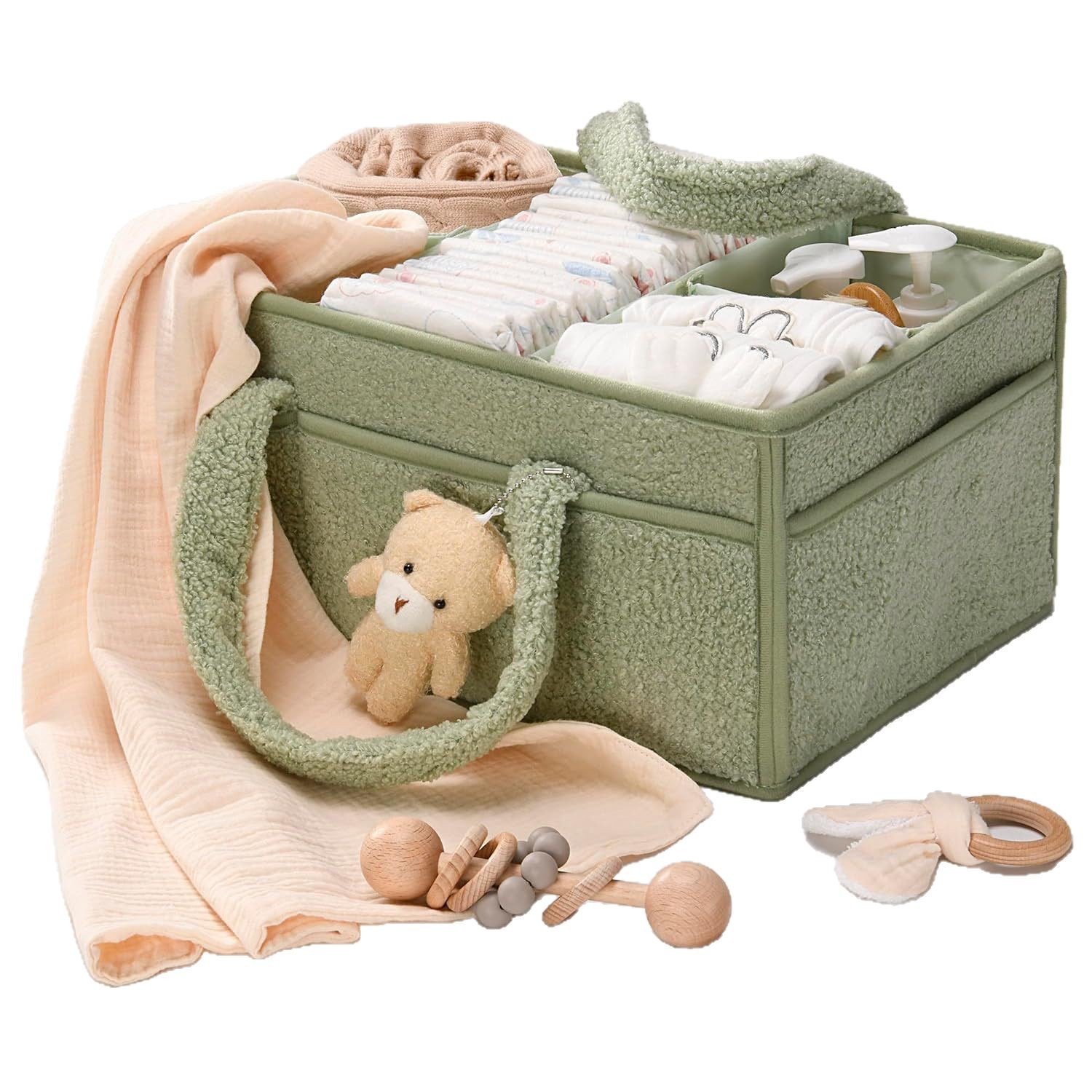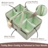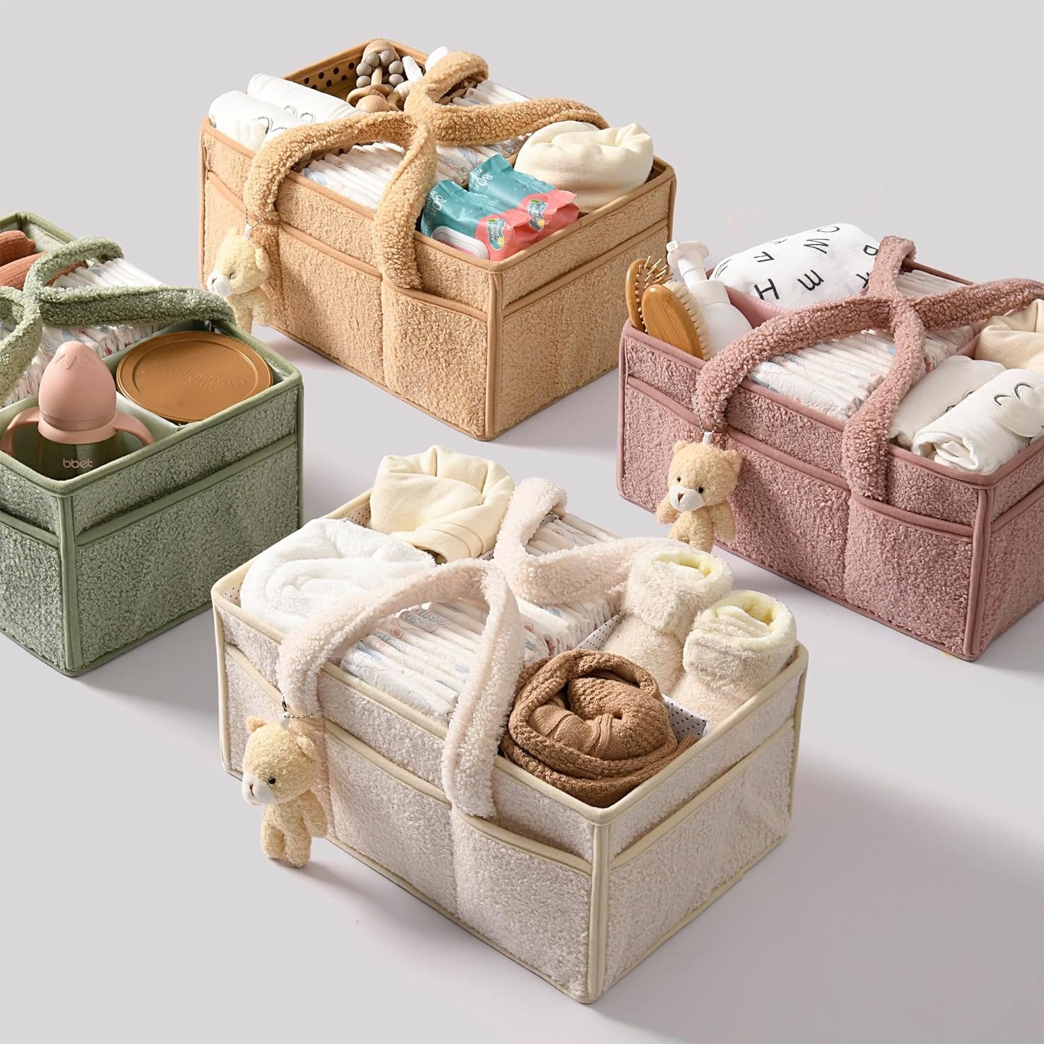 The Teddy Bear Nursery Caddy combines cuteness and practicality. Designed with a soft sherpa-style fabric and a plush teddy charm, it brings warmth to your baby’s nursery while keeping essentials neatly stored. Spacious compartments fit diapers, wipes, bottles, and clothes, while removable modular inserts let you customize the layout. Extra-wide side pockets provide quick access, and long padded handles ensure comfort on the go.